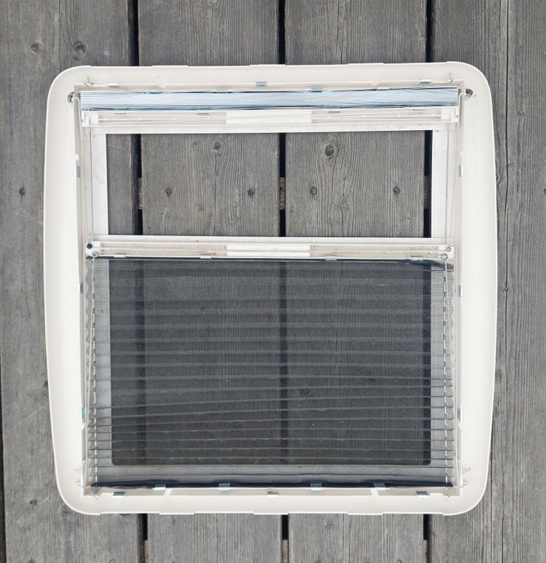 Schon mehrfach musste ich die Führungsnippel für die Zugbänder des Fliegengitters im Innenrahmen der Mini Heki Dachluke reparieren. Diese spiddeligen Plastikhäkchen werden mit der Zeit halt mürbe und brechen ab. Ich habe sie dann durch kleine Schrauben ersetzt. Das hat auch mehrfach gut funktioniert, aber jetzt sind alle Führungen weggebrochen und das plissierte Fliegengitter läßt sich kaum noch verschieben. Also muss doch ein neuer Innenrahmen her.