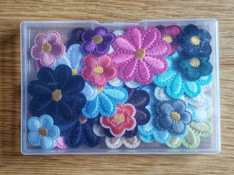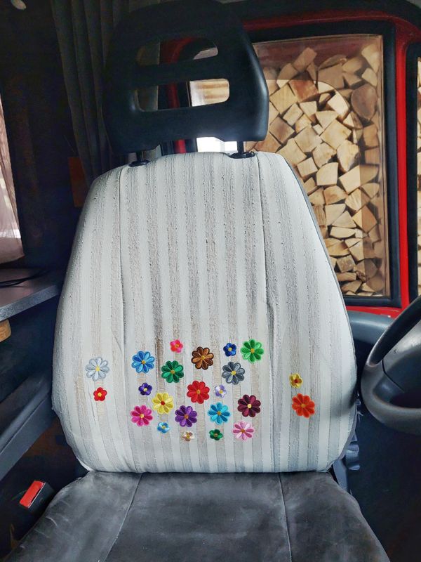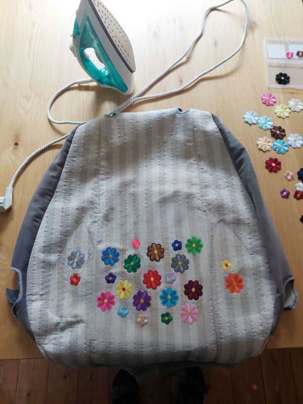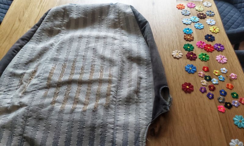 Neue Bezüge im Netz sind einfach nur pott hässlich. Selbst neue bunte Stoffe ein- oder aufnähen dürfte recht schwierig werden. Also teste ich erst einmal, ob das Aufbügeln von Blumen Patches geht (passend zum Flower Power Outfit).