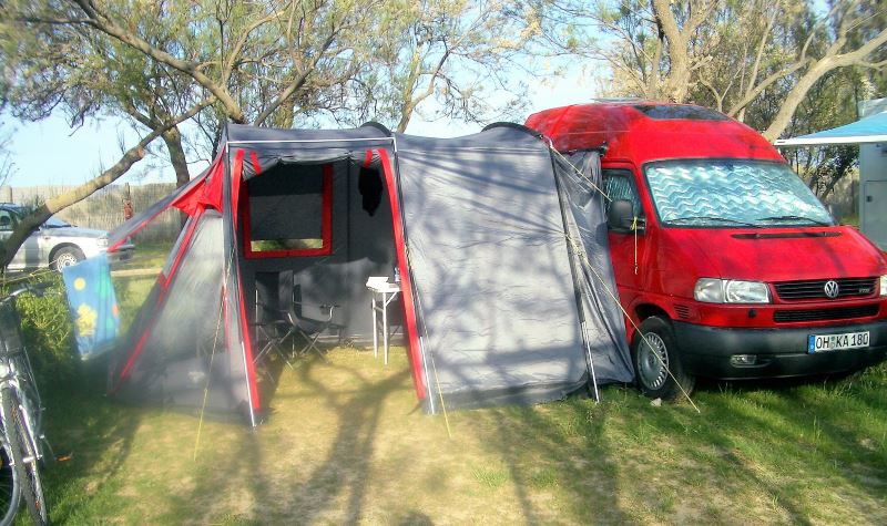Das Dach unseres alten Haus­zel­tes diente als auf­roll­bare Mar­kise.