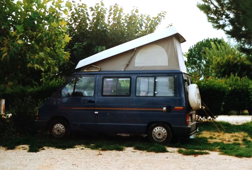 Den blauen Renault Trafic haben wir ge­braucht ge­kauft. Er hat­te eine zum Schla­fen um­klapp­bare Sitz­bank, hin­ten eine Win­kel­kü­che und ein Auf­stell­dach mit Bett.