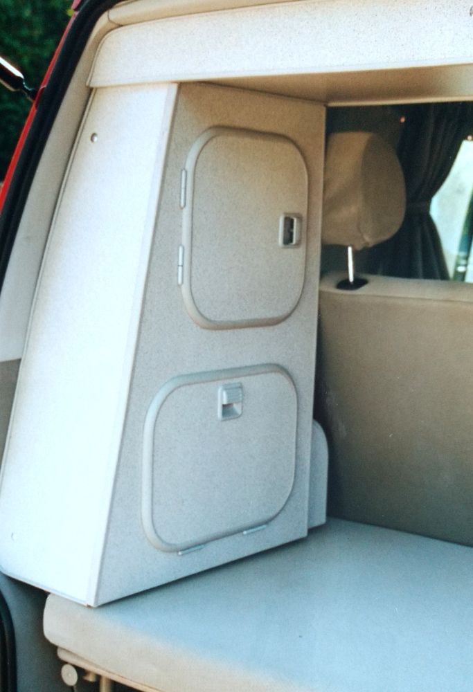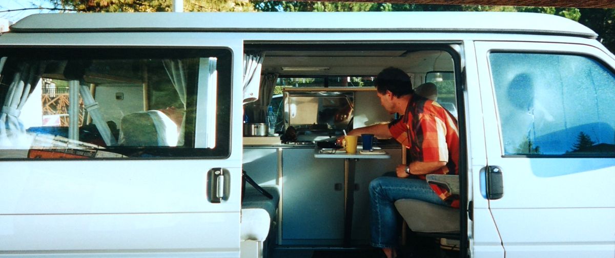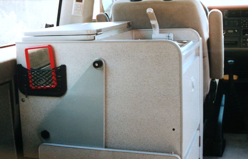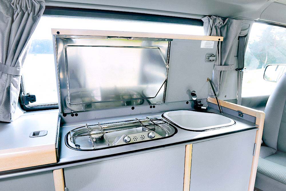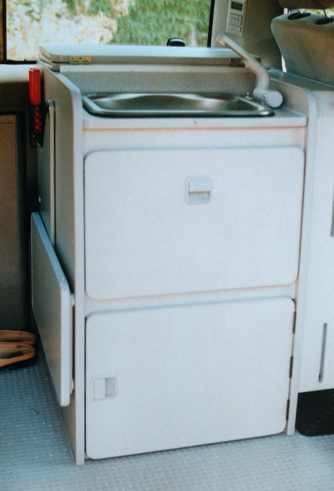 Hinter dem Fahrer­sitz stand ein selbst­ge­bau­ter Schrank mit einer Spü­le, 2 Wasser­tanks für Frisch- und Ab­wasser, einer Kom­pres­sor­kühl­box, einem Gas­kar­tu­schen­ko­cher und ei­nem Porta Potti. An der Seite war eine hoch­klapp­bare Tisch­plat­te an­ge­bracht.