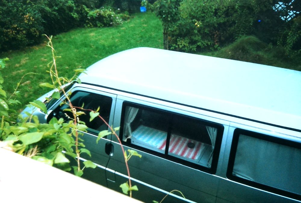 Der 3,20 m lange und 1,80 m hohe Dai­hat­su Hijet Klein­bus war ein Ge­schenk von mei­nem Schwa­ger Rüdiger, der 3-Zy­lin­der-Mo­tor war ka­putt und die Karos­se­rie an mehre­ren Stel­len durch­geros­tet. Ein Hand­ball­kollege hat ihn wieder flott gemacht und ich habe ihn zum Mini­camper aus­ge­baut. Aufs Dach kam eine auf­klapp­bare Holz­kiste mit einer Matratze und Zelt­stoff­ver­span­nungen an den Sei­ten. Erreich­bar war die­ses kleine Klapp­zelt zum Schla­fen über eine Leiter aus Kupfer­rohren an der Heck­klappe.