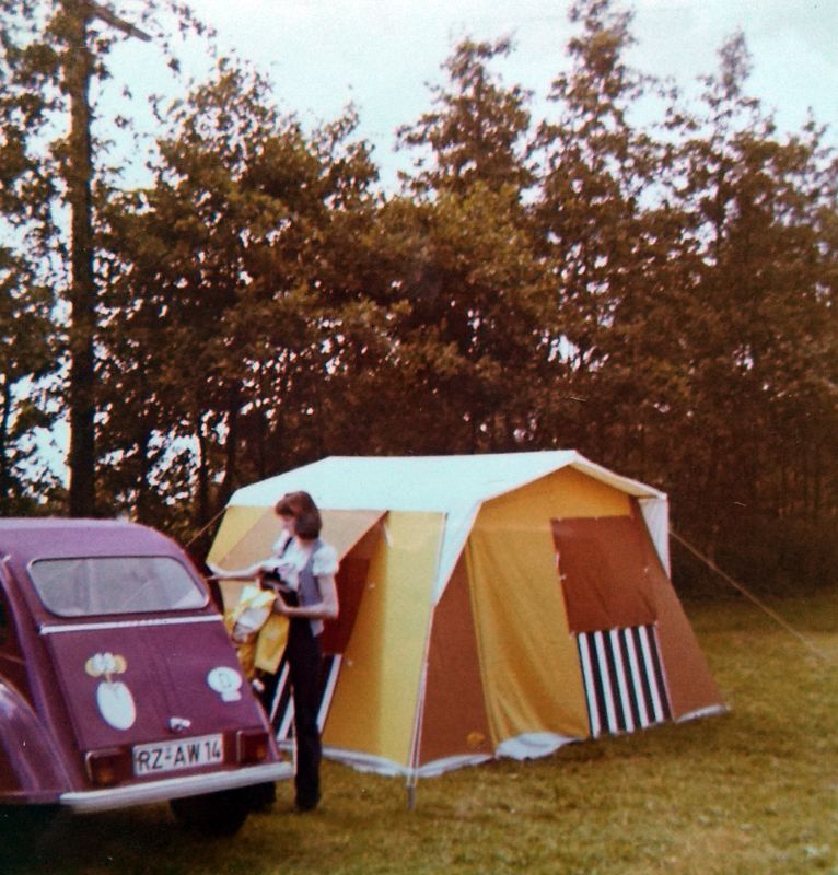 Unser erster Camper. Als Jugendliche waren wir viel mit der Ente 2 CV 6 unter­wegs. Sie war innen mit rot weiß ka­rier­ten Stoff ver­klei­d­et, für kurze Tou­ren kam nur eine Ma­trat­ze hinten rein, für län­ge­re war ein Haus­zelt an Bord!