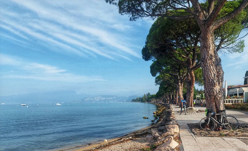 Es geht früh morgens auf eine Radtour am Ufer entlang Richtung Bardolino. Bis 10:00 Uhr kommt man noch einigermaßen durch, danach wird's voll. ... und durch Lazise schlendern. Kleiner Snack, nachher gegen Abend muss Skotti ran. Am kommenden Wochenende ist hier auf dem Campingplatz Oktoberfest. Skotti in Action.