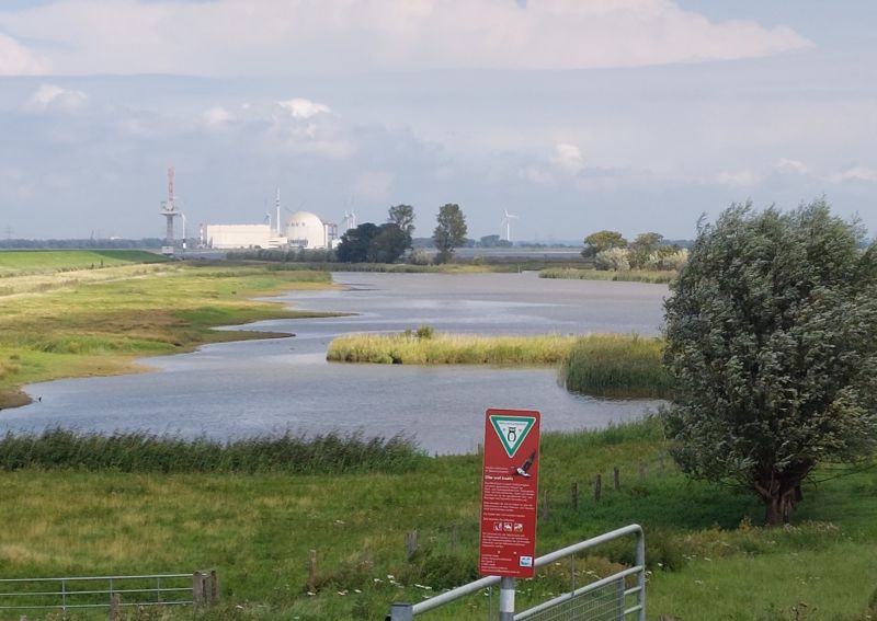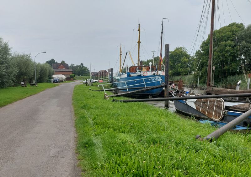 Eigentlich wollten wir 2 Tage in Krautsand bleiben, aber der Ort hat außer dem Elbestrand mit einem Bierzelt nichts weiter zu bieten. Und auch der Campingplatz ist zwar schlicht und sauber, aber in die Jahre gekommen und sagt mir nicht so zu. Von den 3 Plätzen, die wir zur Auswahl hatten, waren 2 unter hohen Bäumen und recht düster und der Platz unmittelbar am Eingang, für den wir uns entschieden hatten, ist doch sehr beengt. Also tingeln wir weiter, der nächste Ort ist Wischhafen mit einem Stellplatz am Alten Hafen.