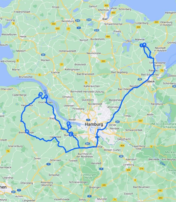 In den letzten Wochen war nur Schietwetter. Ab heute soll’s besser werden, jedoch sollen die Autobahnen voll sein, in 5 Bundesländern sind die Sommerferien zu Ende. Macht nix, wir müssen los. Es geht für ein paar Tage ins Alte Land, vielleicht ist es dort nicht mehr ganz so voll.