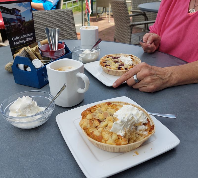 Nach einem Regenschauer geht’s auf Erkundungstour. Im Café und Bistro Hafenhaus soll’s eine Kleinigkeit geben, aber aufgrund von Personalnot gibt’s nur Kuchen.