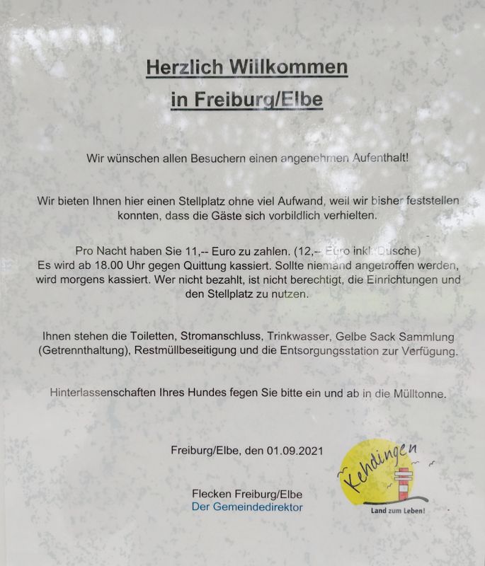 Gegen Abend kommt ein Kassierer, 11,00 € inklusive Strom und WLAN, Dusche kostet 1,00 € zusätzlich. Man kann bis 18:00 Uhr am nächsten Tag bleiben.