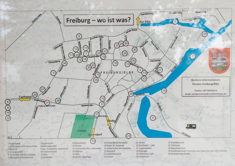 Hübsch, aber uns zu einsam. Weiter geht’s nach Freiburg an der Elbe. Nach einmal Umparken haben wir Sat-Empfang und bleiben.