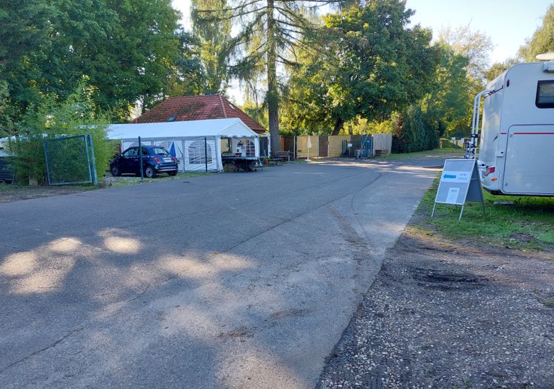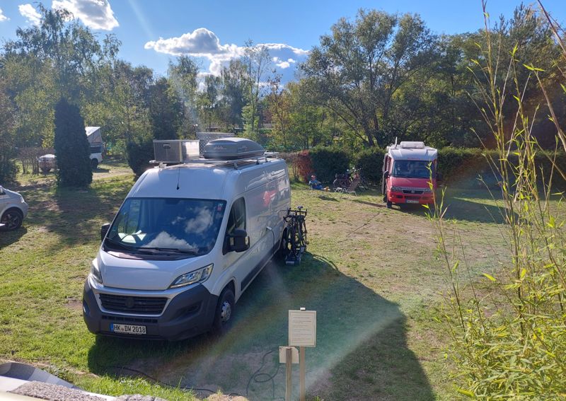 Der neue Betreiber hat einen Wohnmobil Laden mit Werkstatt in Spandau und sein Sohn mit seiner Freundin sind auf dem Stellplatz am schuften. Die Duschen haben wieder heißes Wasser, die Entsorgung funktioniert notdürftig und 2 Stromverteiler sind ok. Und 29,- € alles inklusive für einen innerstädtischen Stellplatz auf Rasen mit Bäumen und Büschen ist total ok.