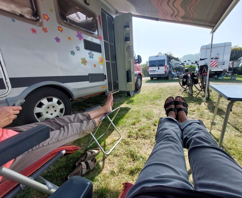 Dann ging’s zum Womo, relaxen, was erst nicht möglich war. Die Klimaanlage unseres Nachbarn war ziemlich laut. Dem Hund war es zu warm und erst nach zweimaliger Aufforderung schaltete er sie aus.