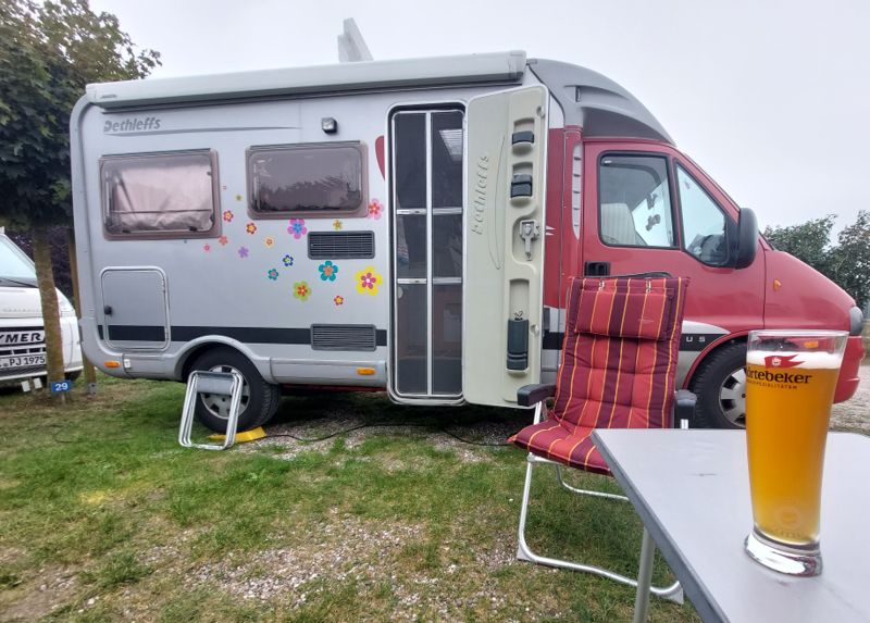 Es geht weiter, von Stellplatz „Stern 22“ zu „Muschel 34“. Wir hatten ja fürs Wochenende verlängert und mussten auf einen anderen Platz umziehen. Hier haben wir Sat-Empfang, aber dafür fast kein Schatten und der Untergrund ist so schief, dass die Keile nicht ausreichen.