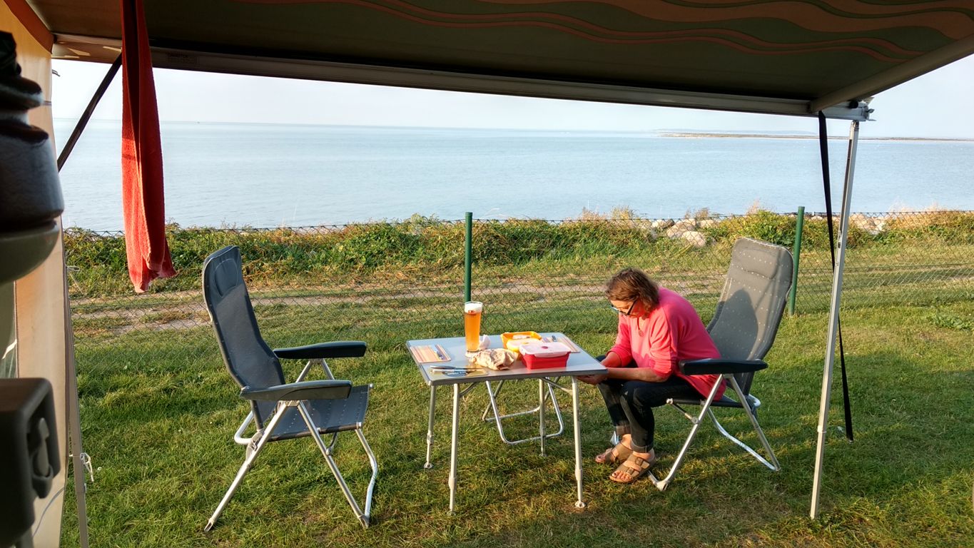Früh morgens ist es bedeckt, Gras und Stühle sind noch feucht. Also im Womo Frühstücken, mit Frühstücksfernsehen – auch mal ganz nett.
