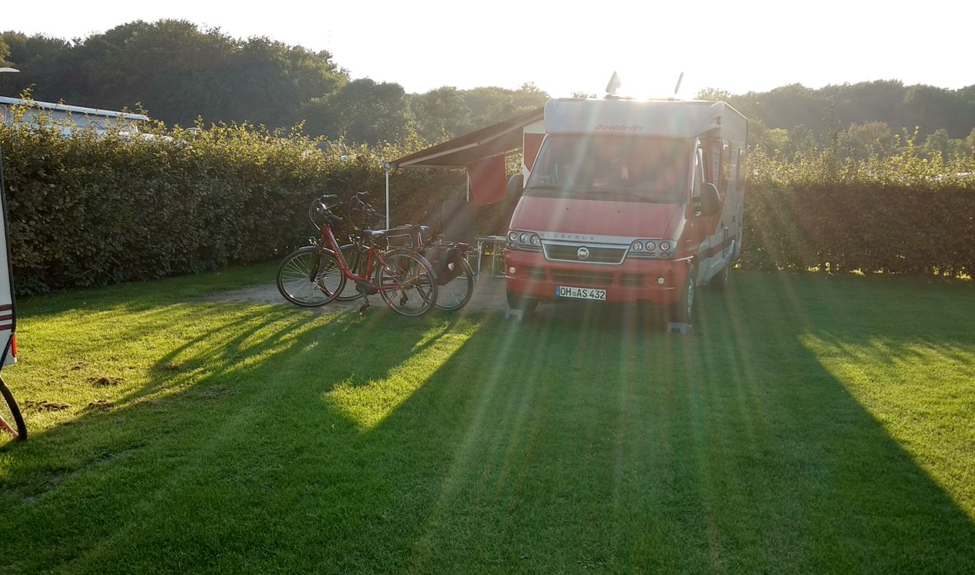 Der DCU Campingplatz in Odense hat morgens nur bis 10:00 Uhr auf und öffnet dann erst wieder um 14:00 Uhr. Also los, gegen 09:45 Uhr sind wir da. Zuerst sollen wir im Schatten parallel zu einer hohen Hecke und im schlammigen Untergrund stehen, bekommen dann aber einen schöneren Platz. Anscheinend erhalten alle, die nur ein bis zwei Tage bleiben, immer erst diese miesen Plätze.