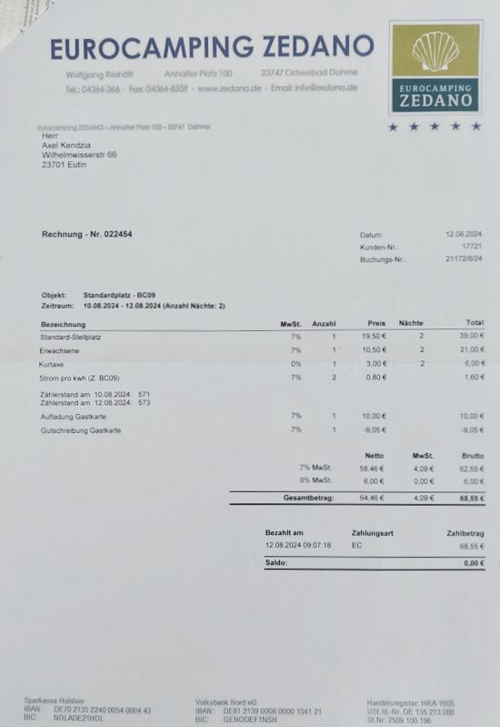 Ich will das schöne Wetter ausnutzen, aber es ist Samstag mitten in der Hochsaison. In Pelzerhaken ist der Platz komplett voll, und es sieht auch nicht so aus, als ob jemand aufbrechen würde. Ich rufe beim Campingplatz Zedano in Dahme an, und tatsächlich, es sind noch Plätze frei.
