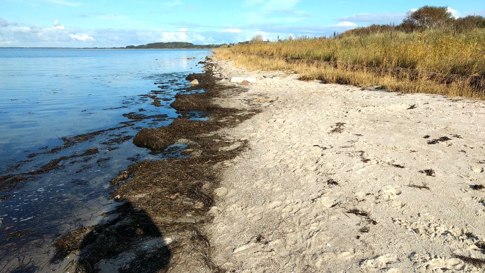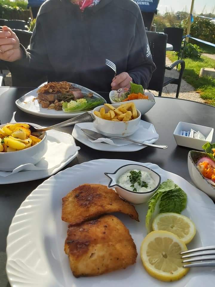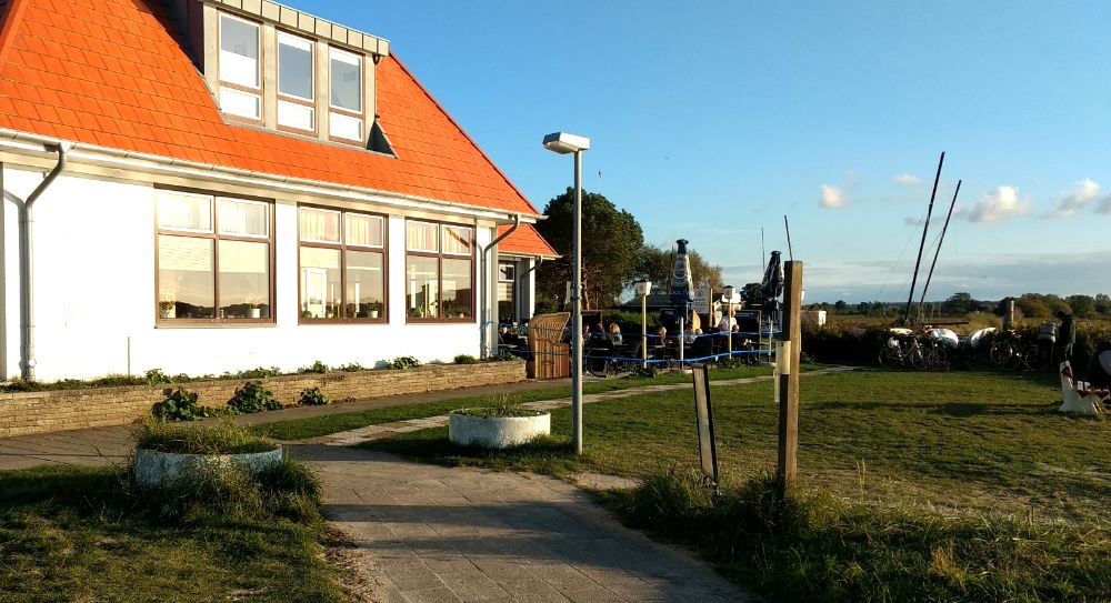 Bei strahlendem Sonnenschein geht’s weiter nach Wackerballig. Das kleine Örtchen in der Geltinger Bucht und der Stellplatz am Yachthafen gefallen uns gut. Im Gegensatz zu gestern ist es hier vor allem entspannt. Mittag gibt’s gleich gegenüber auf der Terrasse des Restaurants „Dat Strandhuus“ mit Blick aufs Wasser. Mein Entrecôte war eine 2, Sabines gebackener Dorsch eine 3.