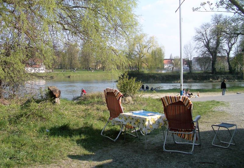 Während des Frühstücks parkt ein altes Womo neben uns ein, das war’s mit der Sonne! Wir beschließen hier zu bleiben und auf einen schönen großen Platz mit Blick auf die Isar umzuziehen, kostet 3,80 € mehr, das ist ok.