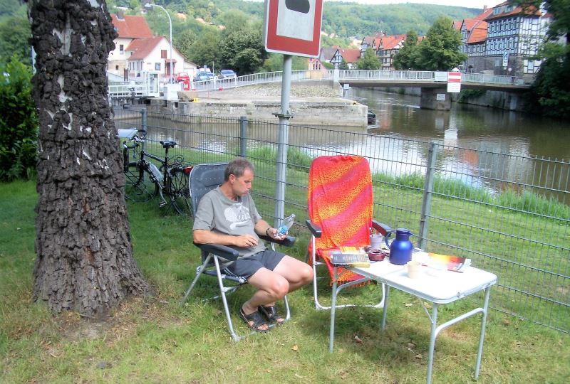 Heute weiter nach Hannoversch Münden. Um 09:00 Uhr los, um 12:00 Uhr Ankunft. Wetter super schön, erstmal Kaffee und in der Sonne sitzen. Zwischendurch kleinen Snack und Stadtfein machen. Hier ist es immer wieder schön, es gibt alles was man für einen kleinen Zwischenstopp braucht. Wir stehen auf dem Campingplatz am Wasser, wo Werra und Fulda zur Weser zusammenfließen. Auf dem Weserstein steht: „Wo Werra sich und Fulda küssen, sie Ihren Namen büssen müssen. Und hier entsteht durch ihren Kuss, Deutsch bis zum Meer der Weser Fluss.“