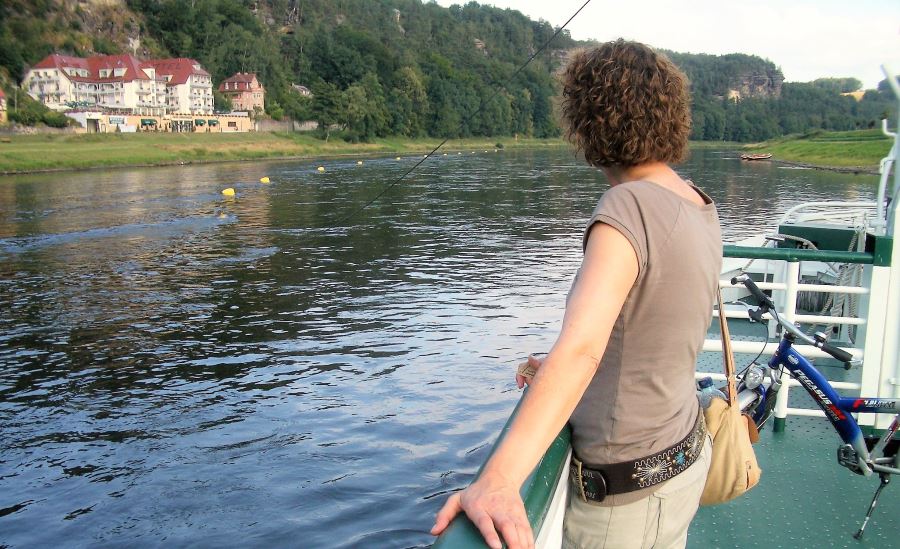 Nachts hat es geregnet und gewittert, es weht ein leichter Wind. Nach dem Frühstück geht’s nach Dresden, wollen dort auf einem Campingplatz in der Nähe stehen. Sandra, unser Navi, lotst uns erstmal falsch, landen an einem ganz anderen Ende! Also nochmal, und Platz gefunden. Ist aber nicht so toll. Also weiter nach Königstein direkt an der Elbe. Rufe vorsichtshalber dort an, es sind noch Plätze frei. Ist wirklich schön, stehen auf einer kleinen Terrasse mit Blick aufs Wasser. Schiffe, Ausflugsdampfer, kleine Boote und Kanus fahren vorbei. Nach dem Abrötern sitzen wir im Schatten, es weht zum Glück ein leichter Wind. Gegen 17:30 Uhr fahren wir noch mal in den Ort, der Radweg führt direkt am Wasser entlang. Wenn man die träge Elbe so sieht, kann man sich kaum vorstellen, dass sie vor Kurzem über die Ufer getreten war. Der Campingplatz war damals total überflutet. Im Ort zeugen Tafeln an den Häusern von den Hochwasserständen, teilweise bis zu 2. Etage. Wahnsinn, die armen Leute!