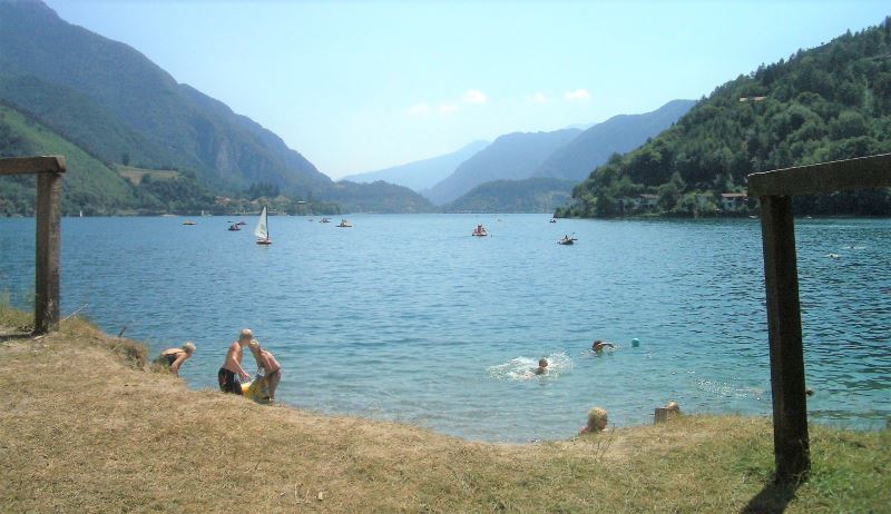 Nach dem Frühstück geht’s weiter Richtung Baitoni, auch ganz schön, doch wir fahren weiter. Wollen an einen anderen Bergsee. Eine abenteuerliche Fahrt durch Serpentinen. Überall „Turno“ gefährliche Kehren, aber selbst hier fahren Lkw. Man muss höllisch aufpassen. Landschaftlich natürlich wunderschön, durch Schluchten und grüne Berge, mitten durch ca. 15 km. Hört sich wenig an, aber durch die zerklüftete Strecke ganz schön lang. Dann wird’s schöner und wir kommen nach Pieve di Ledro, ein kristallklarer Bergsee mit einer herrlichen Farbe. Gehen auf einen Campingplatz und rötern ab. Hier endlich mal gemischtes Publikum, Italiener, Niederländer, Österreicher, Deutsche, alles tuti! Nach dem obligatorischen Kaffee geht’s baden. Schön kühl, herrlich erfrischend. Dann raus aus der Mittagssonne vors Womo essen und lesen.