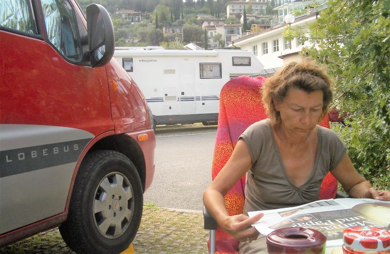 Auf geht’s nach Italien über den Brenner. Um 10:00 Uhr los, gut durch gekommen, Wetter herrlich. Sind um 14:00 Uhr am Gardasee. Fahren nach Lazise, leider Camping Du Parc voll. Entmutigt machen wir uns auf den Weg nach Bardolino. Dazu müssen wir durch Lazise fahren. Uns fällt das Schild Municipale Camping ins Auge. Erinnern uns und beschließen dort zu fragen. Haben Glück und ergattern den letzten Platz. Beim letzten Besuch war uns der Platz schon aufgefallen, am Rand der City an der Promenade und am Wasser. Damals hatten wir uns vorgenommen, hier mal zu stehen. Abrötern, Kaffee und ans Wasser. Uns gegenüber steht ein riesiges Schlachtschiff, ein Phönix, zwei ältere Herrschaften mit extra Auto und Roller. Nach dem Schwimmen Dusche und stadtfein machen. Lecker Cappuccino und Birra. Danach fürs Abendessen eingekauft, Spaghetti Aglio. Später Musik im Strandcafé am Wasser und Panoramablick genießen. Am Mittwoch ist hier Markt, supi!