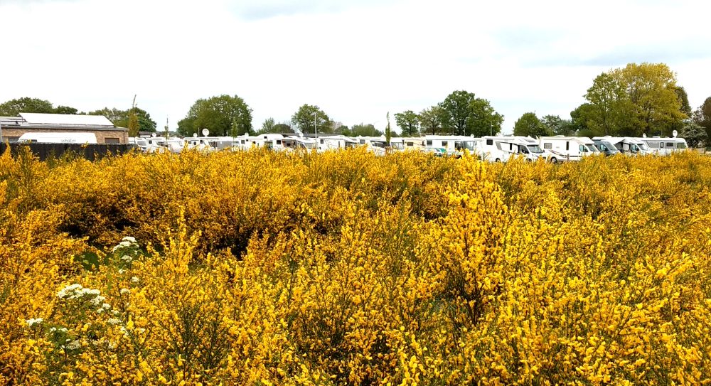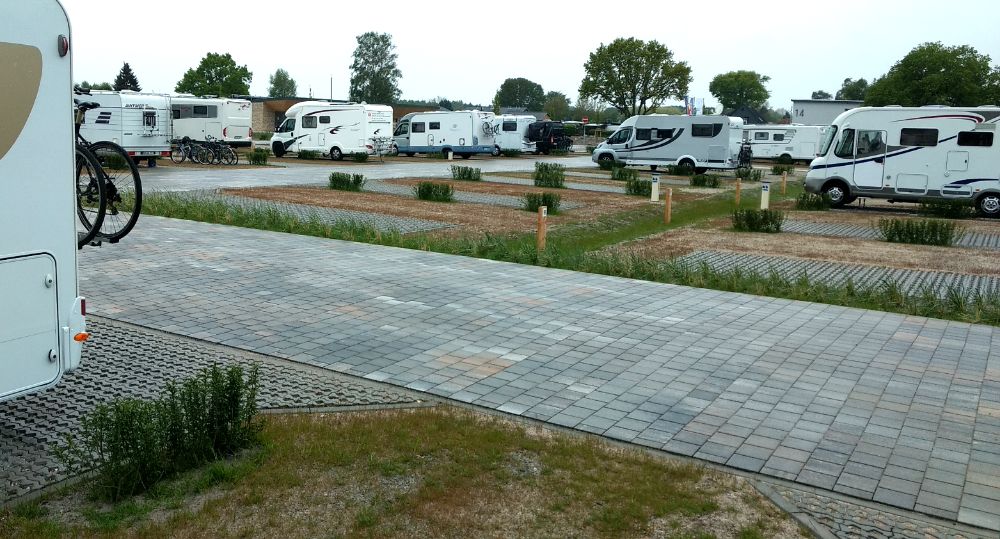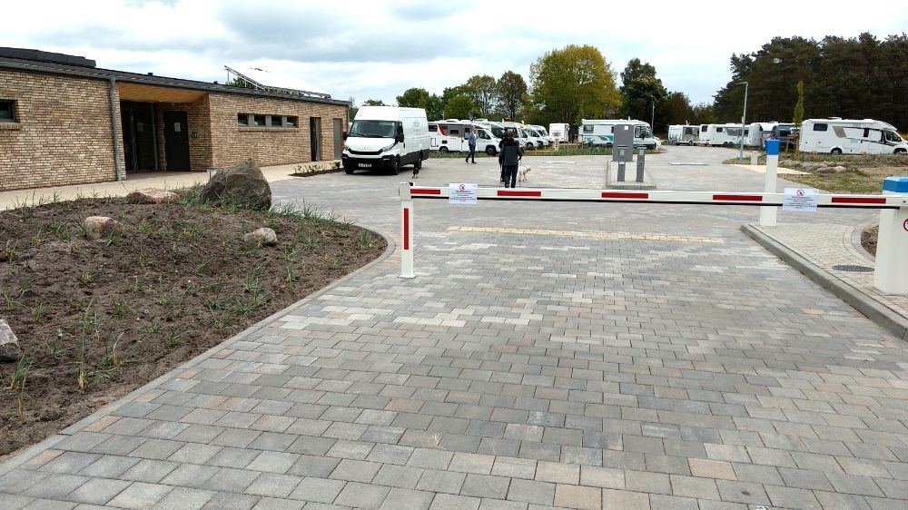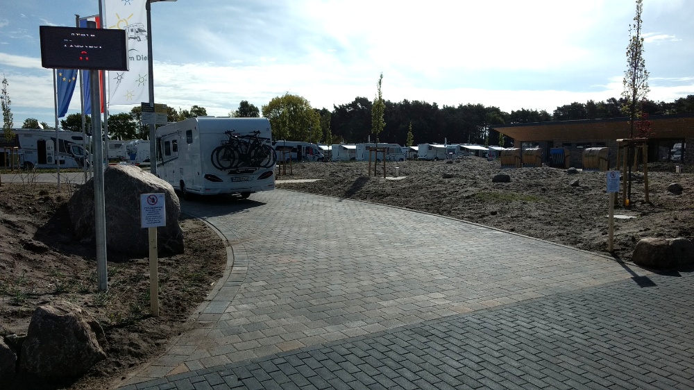 Als wir gegen 08:30 Uhr an­kom­men, sind von den 154 Plät­zen noch 107 frei. Die Par­zel­len sind alle recht groß, wir bekom­men noch eine am Rand mit Blick auf ein noch ge­schlos­se­nes Jugend­zelt­lager. Der Auto­mat zum Ein­checken funk­tio­niert noch nicht so rich­tig, die einge­tipp­ten Buch­sta­ben wer­den zum Teil nicht an­ge­nom­men. Es bil­det sich eine län­gere Schlan­ge, aber alle halten Ab­stand. Sonst ist aber alles Top. Aller­dings ist die Kasset­ten­ent­lee­rung nur über eine Cam­per­Clean An­lage für 2,50 € mög­lich, also nicht kos­ten­frei wie bewor­ben. Auch das WLAN funk­tio­niert noch nicht! Der Platz füllt sich rasch, gegen Abend ist er zu drei­vier­tel gefüllt.