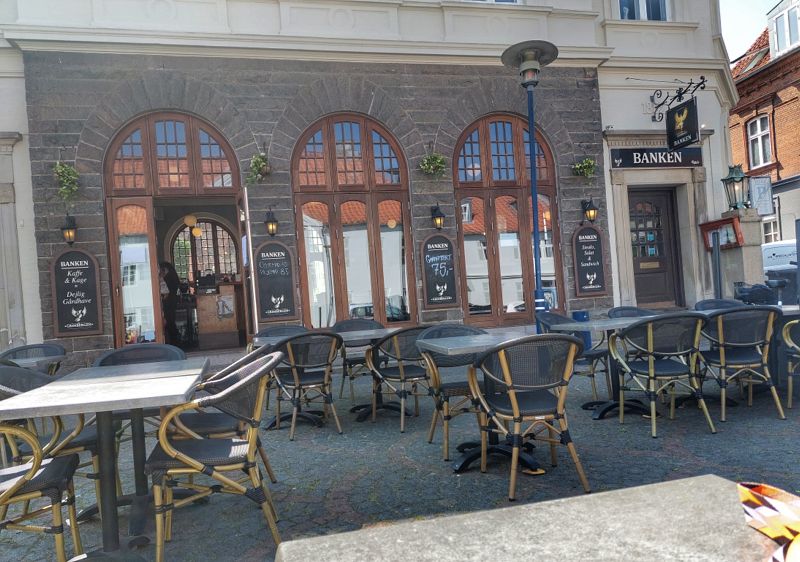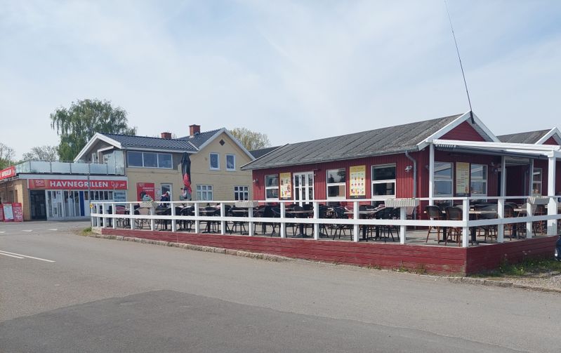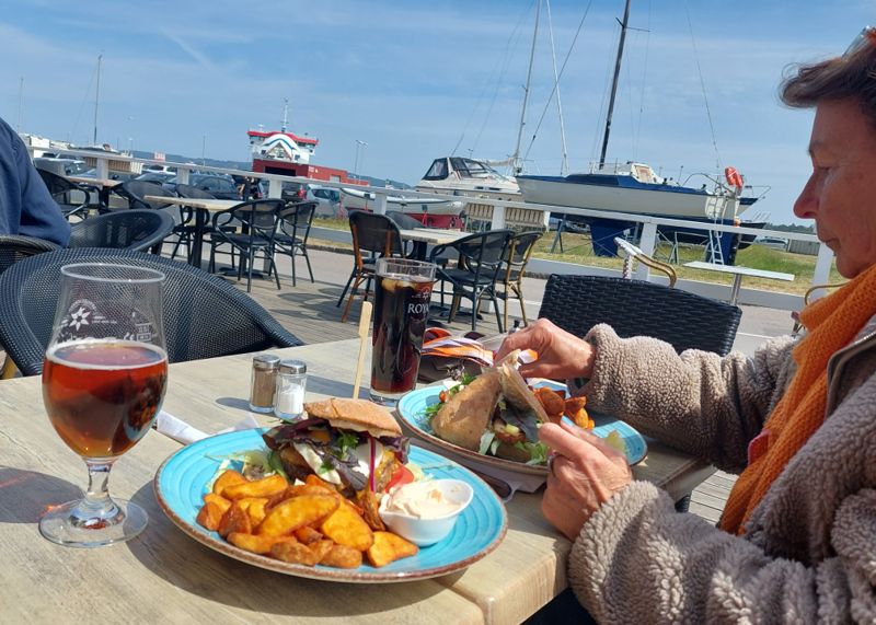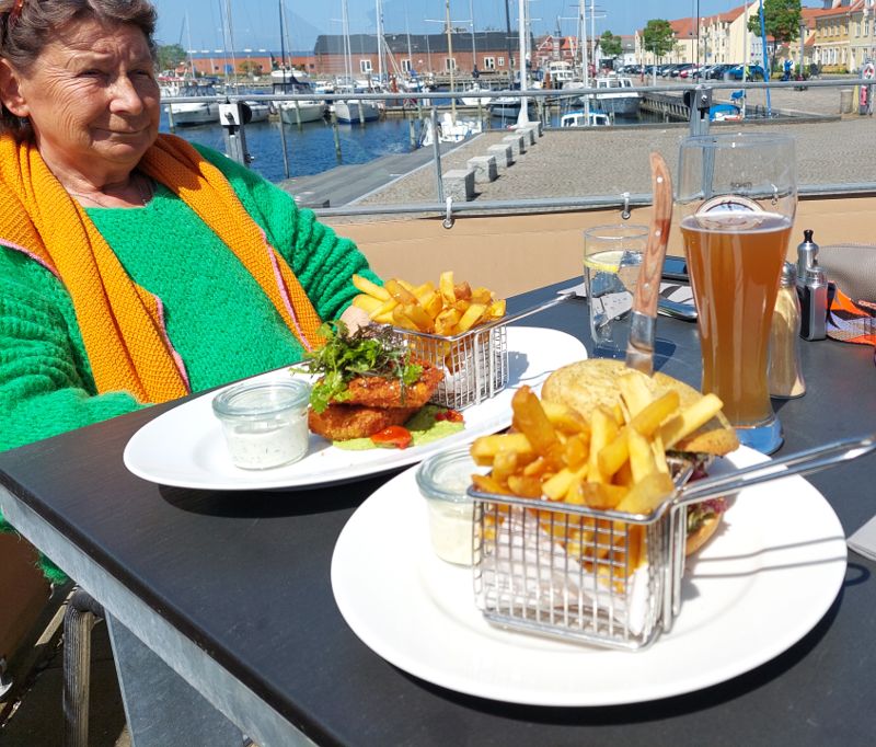 Gleich nebenan gibt es mehrere Cafés und einen Grill. Auf der Terrasse des Café Havnsø speisen wir, einen Tex-Burger und ein Hähnchen-Sandwich, ganz ok eine glatte 3.