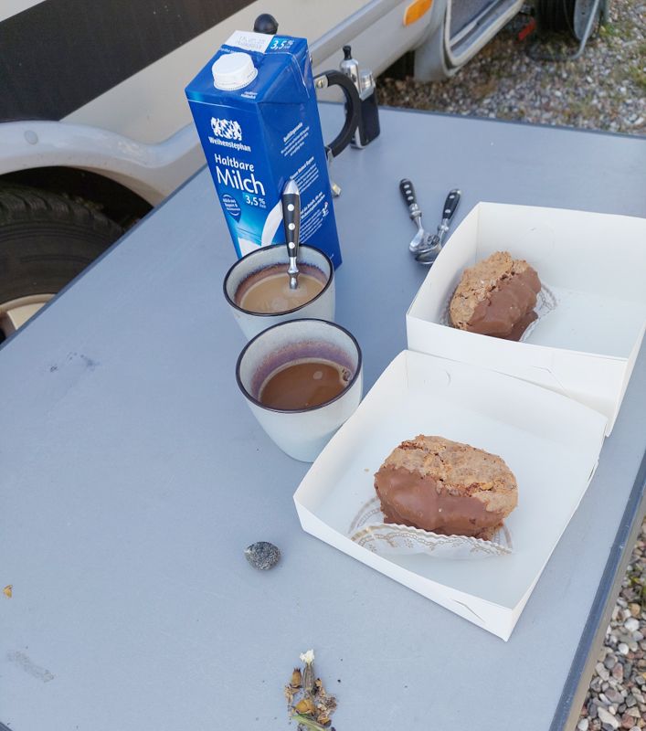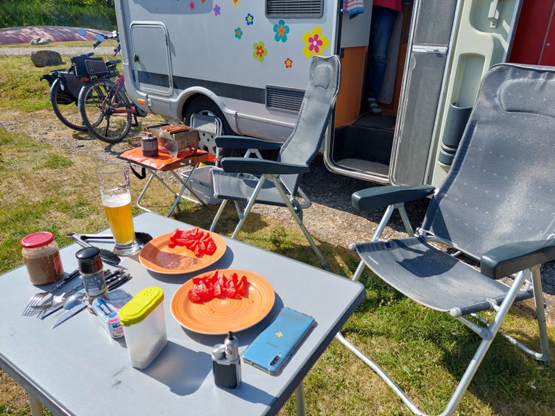 Wir haben für 2 Tage gebucht und Heute ist faulenzen angesagt. Erstmal verpennen wir bis um kurz vor Acht, haben ja auch letzte Nacht wegen des Sturms unruhig geschlafen! Zum Frühstück gibt’s vom Campingplatzbetreiber selbst gebackene Brötchen. Und dann kommt auch langsam die Sonne raus.