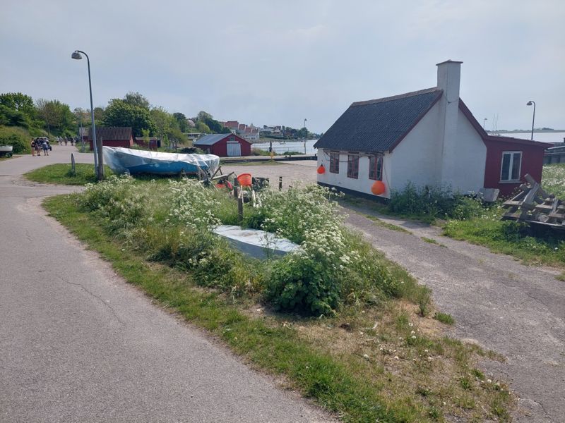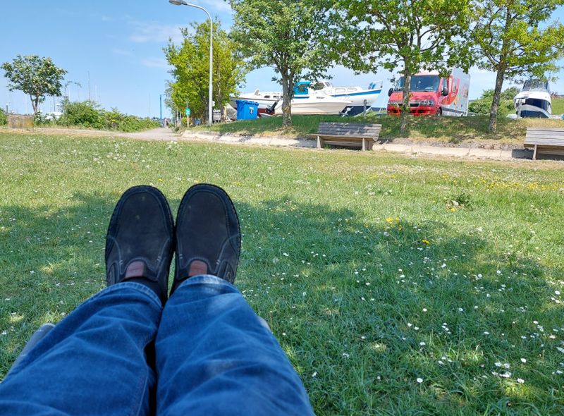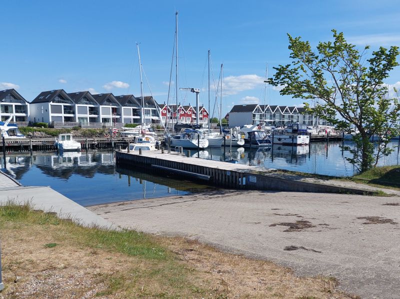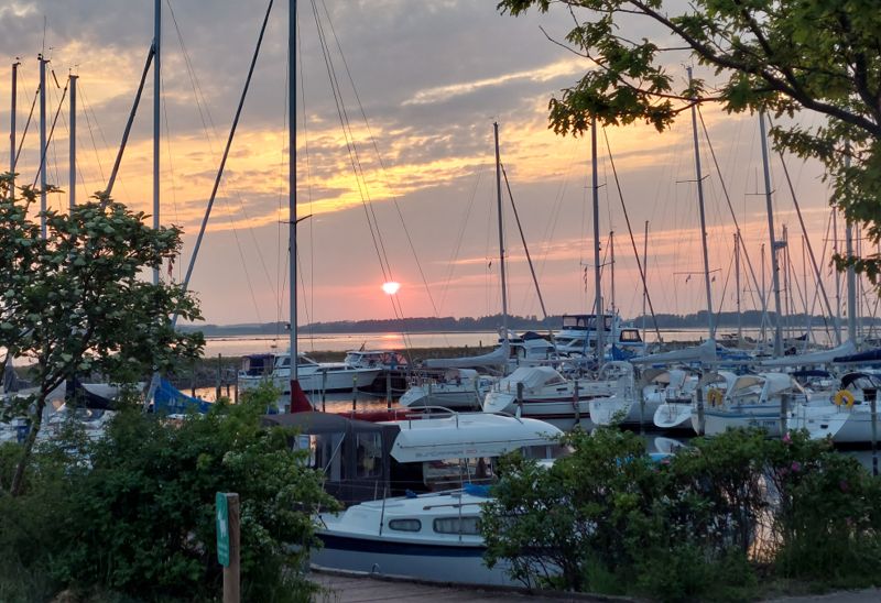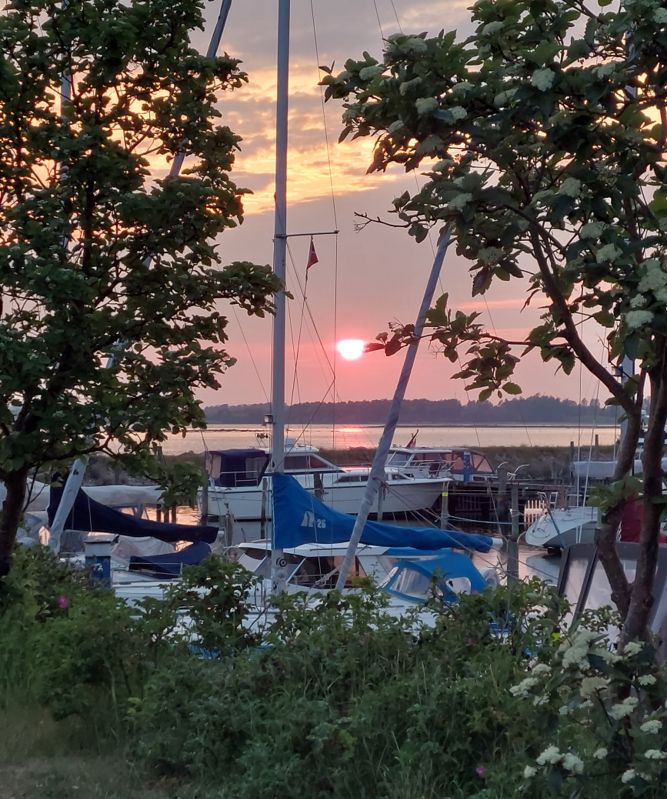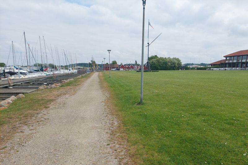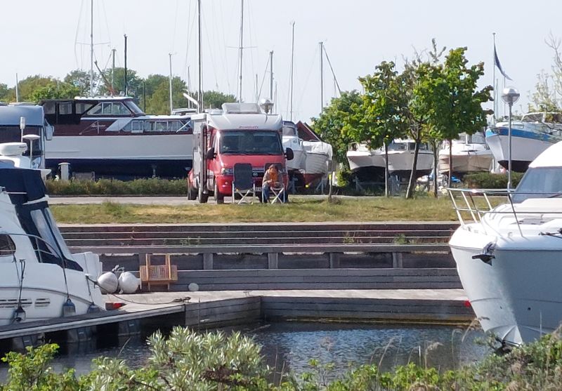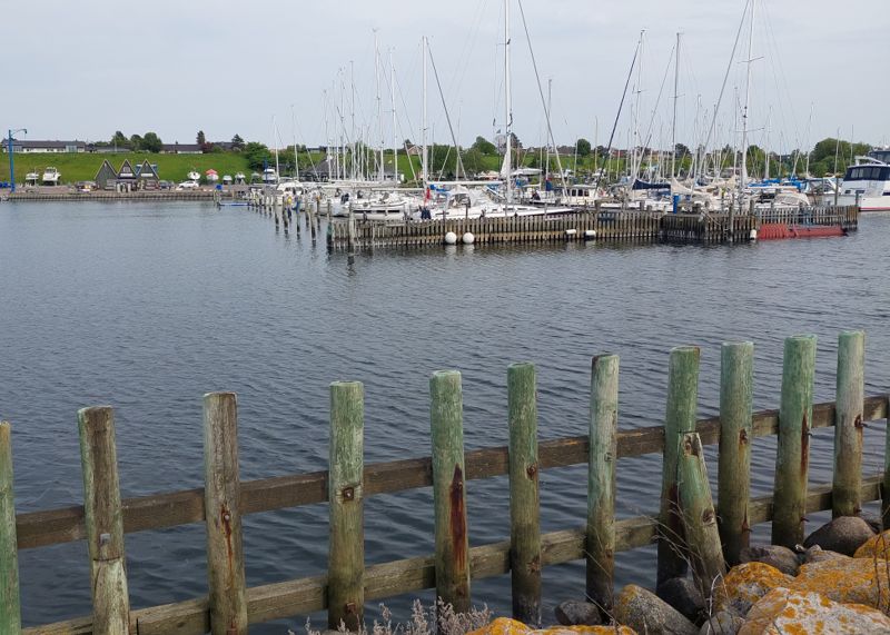Wir können uns nicht entscheiden. Bleiben wir noch, dann würde ich gerne auf einen Platz mit Hafenblick umparken, es müssten eigentlich welche frei werden. Allerdings kann ich keine schöne Fahrradtour unter 20 km zusammen stellen. An der Küste sind überall Hüttendörfer, die bis an den Strand reichen. Und als ein Stellplatz frei wird, kommt gerade ein neues Womo. Also doch weiter in die Marina von Jyllinge. Und die Entscheidung war gut, ein tolles ruhiges Örtchen. Vorm Womo eine große Wiese mit Baumschatten und gleich nebenan ein Chinarestaurant mit Hafenblick.