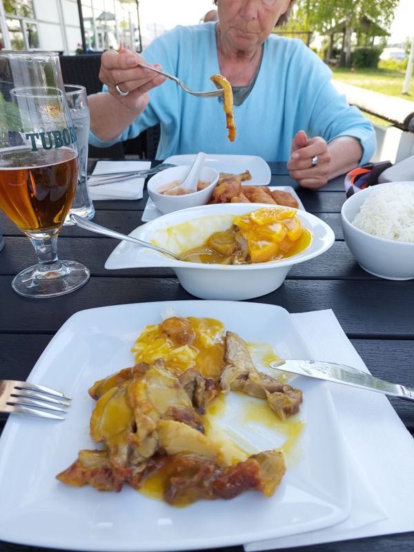 Mittag gibt’s beim Chinesen Ny Asien, haschiertes Hünerfleisch und Ente mit Orangensauce. Der Ausblick ist grandios, das Essen geht so, eine 3-. Danach auf die Wiese.