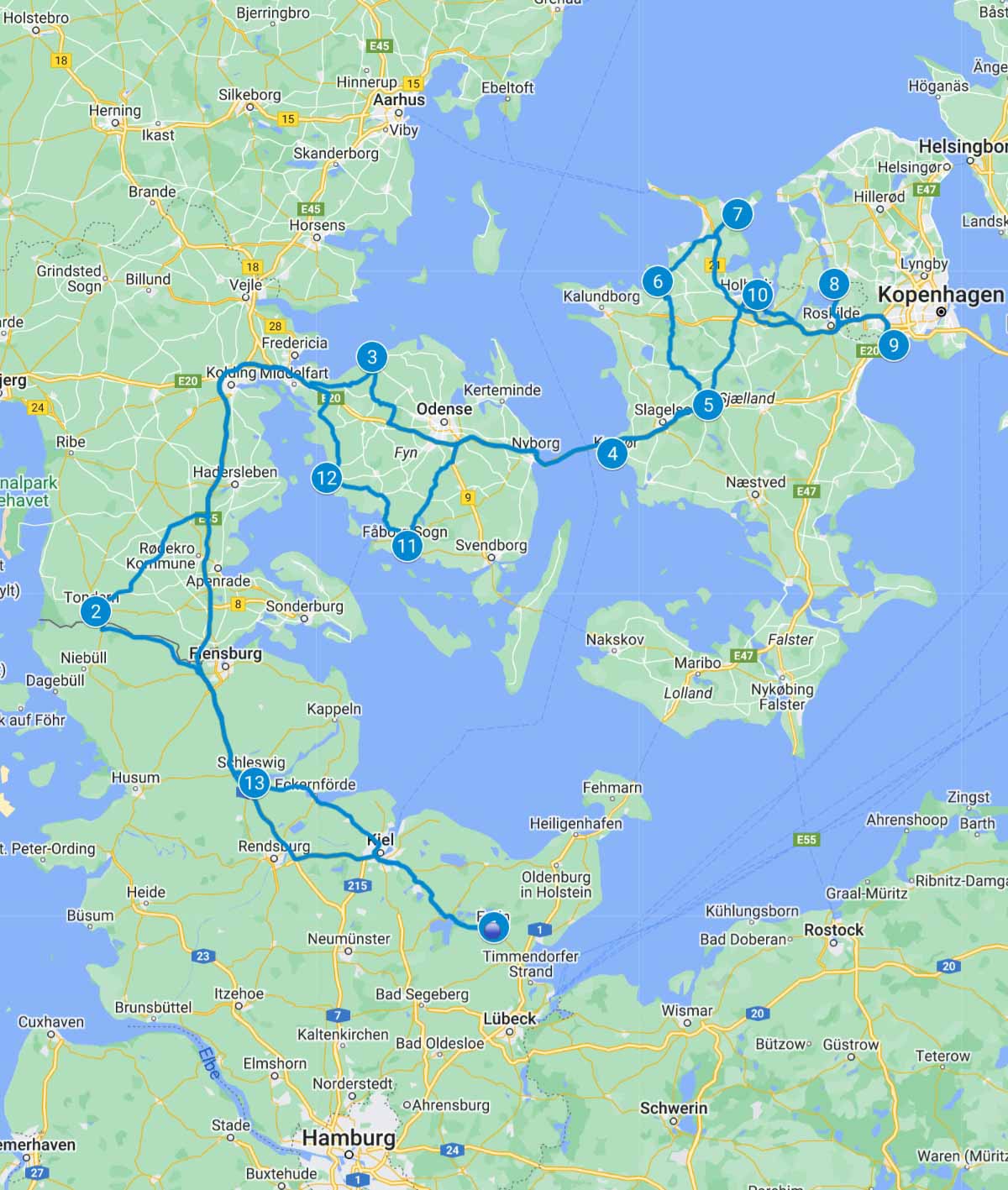 2 Wochen Dänemark reichen erst einmal wieder. Außerdem ist uns auf der Storebaelt Brücke das vordere Kennzeichen weggeflogen, und irgendwie möchten wir so nicht länger im Ausland rumfahren.