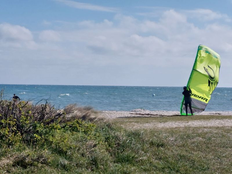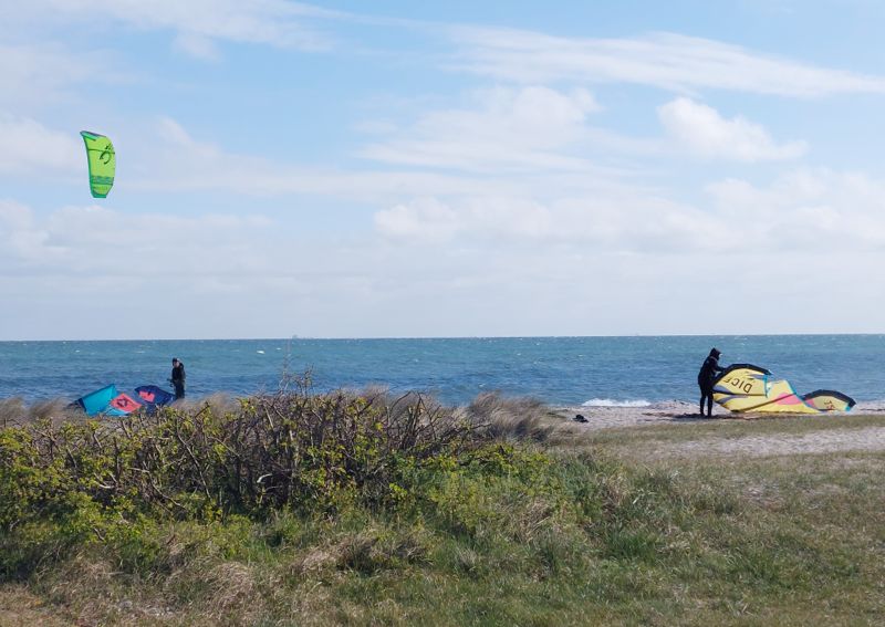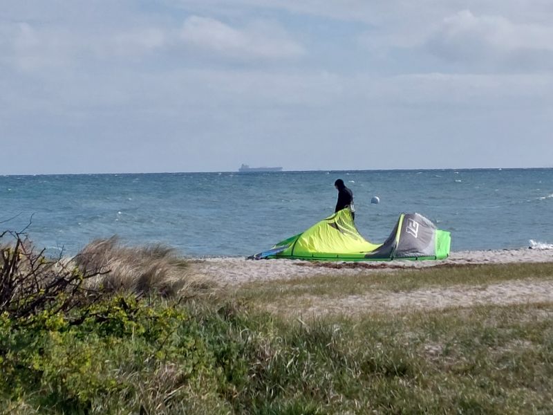 Heute Morgen pustet noch ein leichter Wind, aber die Sonne scheint und der erste Kiter ist früh draußen.