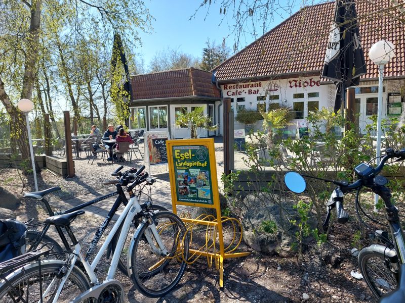 Nachmittags radeln wir zum Restaurant & Cafe Niobe in Gammendorf. Der Kaffee und der Kuchen im »Sand-Tropez« gefallen uns aber besser, also zurück gegen den Wind!