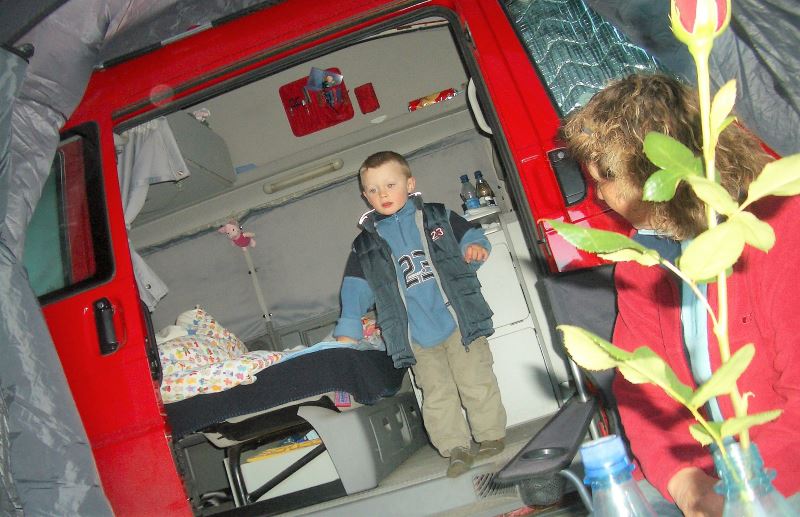 Hat leider geregnet, aber nach dem Frühstück wird’s besser. Sind mit Max ins Spielzelt, dort hat er mit anderen Kindern gebastelt.