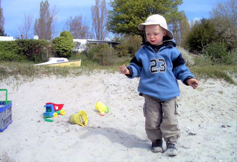 Dann mit Eimer und Schaufel zum Strand. Wollen später, wenn der Laden wieder auf hat, noch einen Käscher holen. Es ist herrlich am Strand, so viele Steine und Muscheln. Später zum Platz, umziehen und zum Essen. Max Fisch­stäbchen mit Pommes, wir Spargel, war lecker. Zurück am Womo fertig machen fürs Bett. Mit Max ins Waschhaus und Zähne putzen, unterwegs viele Kaninchen. Das findet er klasse. Im Womo noch eine Geschichte und schlafen. Ging super gut, Stand und Spielplatz machen müde.