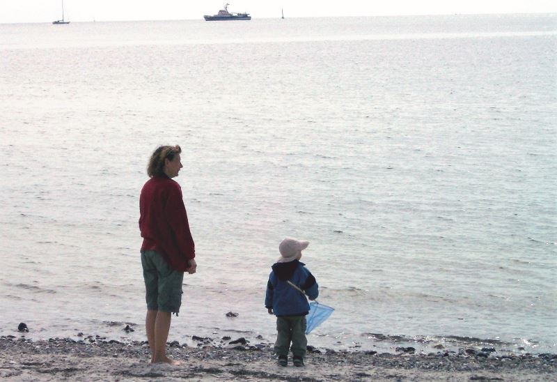 Da das Bistro immer noch zu hat, beschließen wir nach Puttgarden zum Fährbahnhof nach Dänemark zu fahren. Das war aufregend, diese riesigen Schiffe, und dann haben die auch noch eine Klappe, in die Autos und Lkw rein und raus fahren. Dann sind wir in den Bord-Shop Essen, von dort konnte man noch besser sehen. Zurück auf dem Platz Spielplatz und Strand.