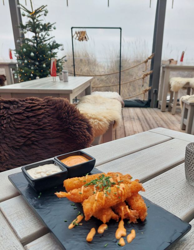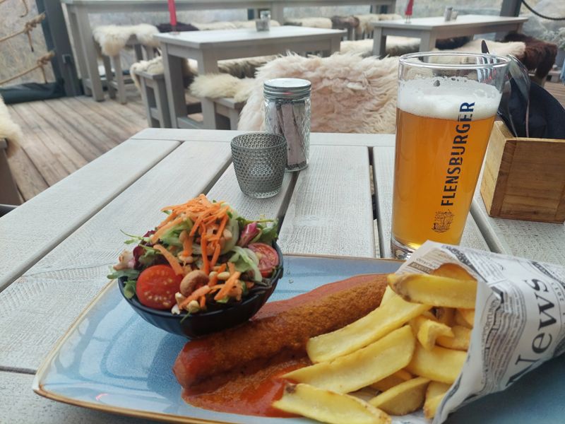 Der Glühwein im Beach House ist super lecker, und dann Currywurst, vorweg Garnelen.